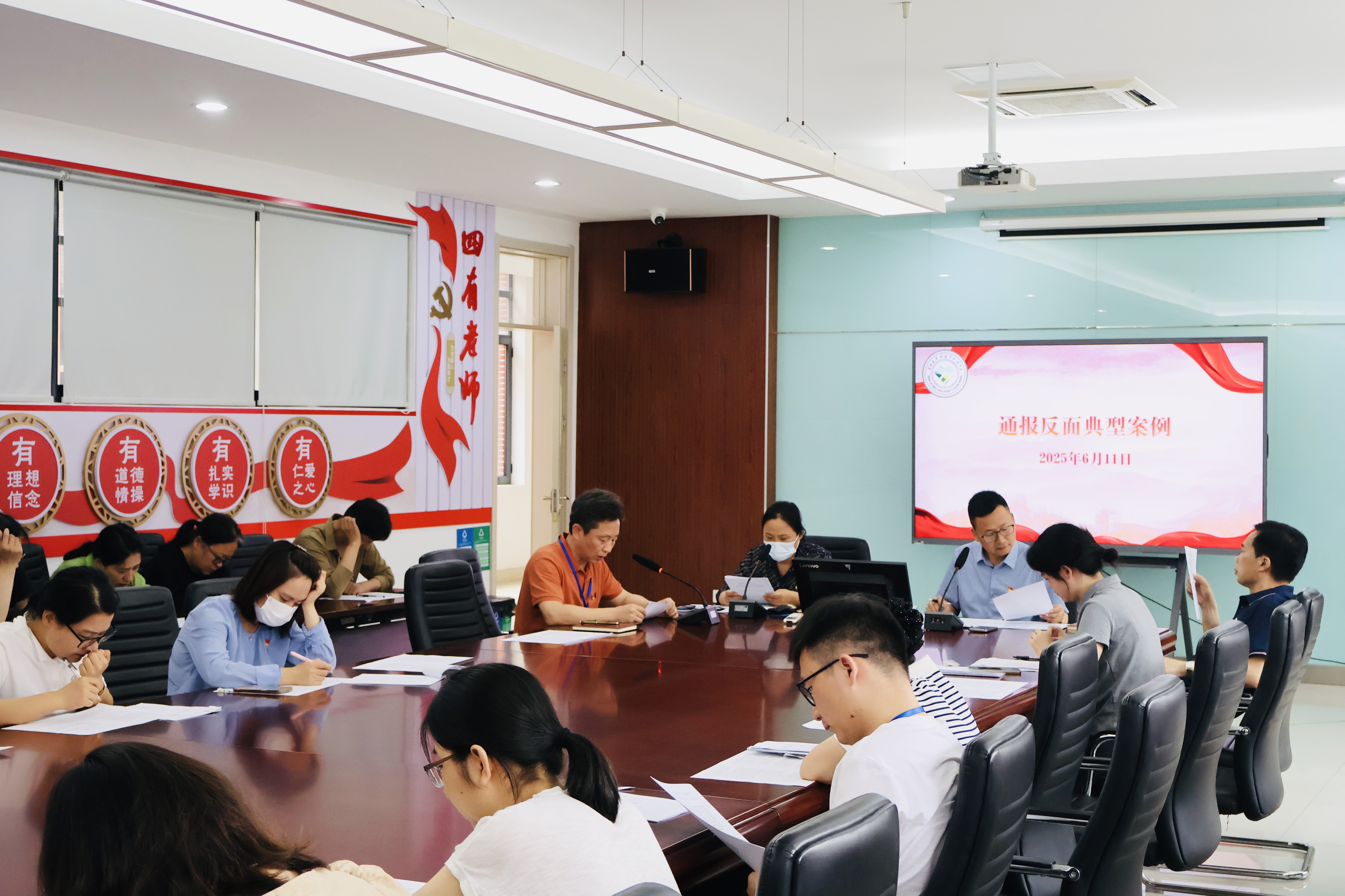 2. 案例通报与分析, 由党员教师代表陈明周通报近期查处的违规吃喝典型案例,深入分析案例中违规行为的表现形式、产生原因和危害后果,引导党员教师从中汲取教训。