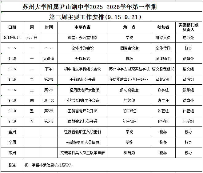 苏州大学附属尹山湖中学2025-2026学年第一学期第三周工作安排