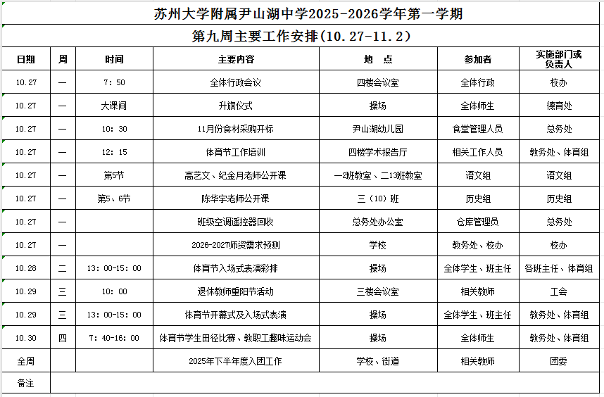 苏州大学附属尹山湖中学2025-2026学年第一学期第九周工作安排