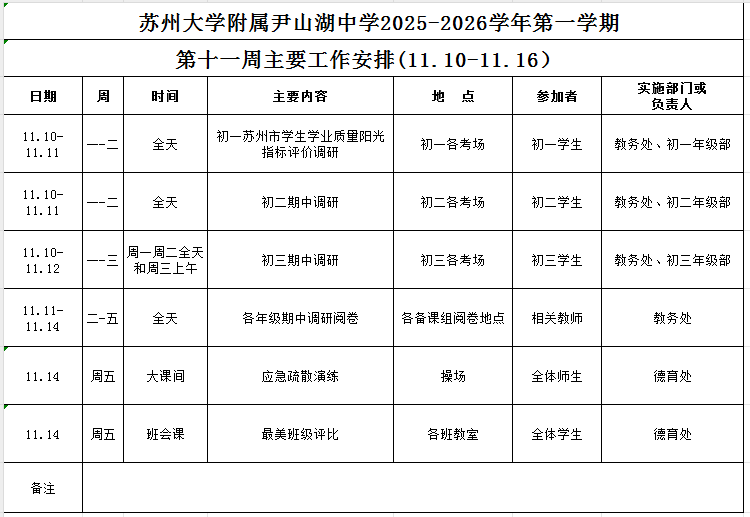 苏州大学附属尹山湖中学2025-2026学年第一学期第十一周工作安排