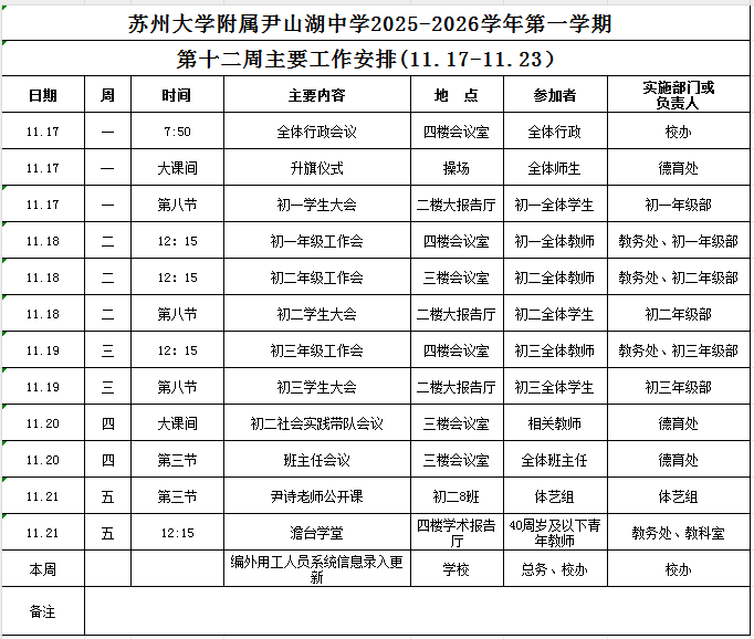 苏州大学附属尹山湖中学2025-2026学年第一学期第十二周工作安排