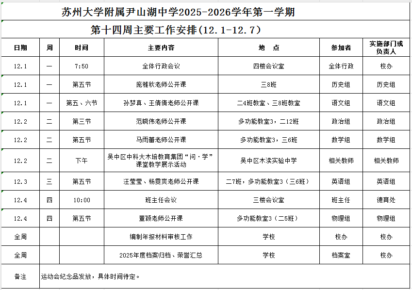 苏州大学附属尹山湖中学2025-2026学年第一学期第十四周工作安排