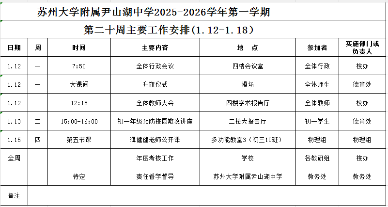 苏州大学附属尹山湖中学2025-2026学年第一学期第二十周工作安排